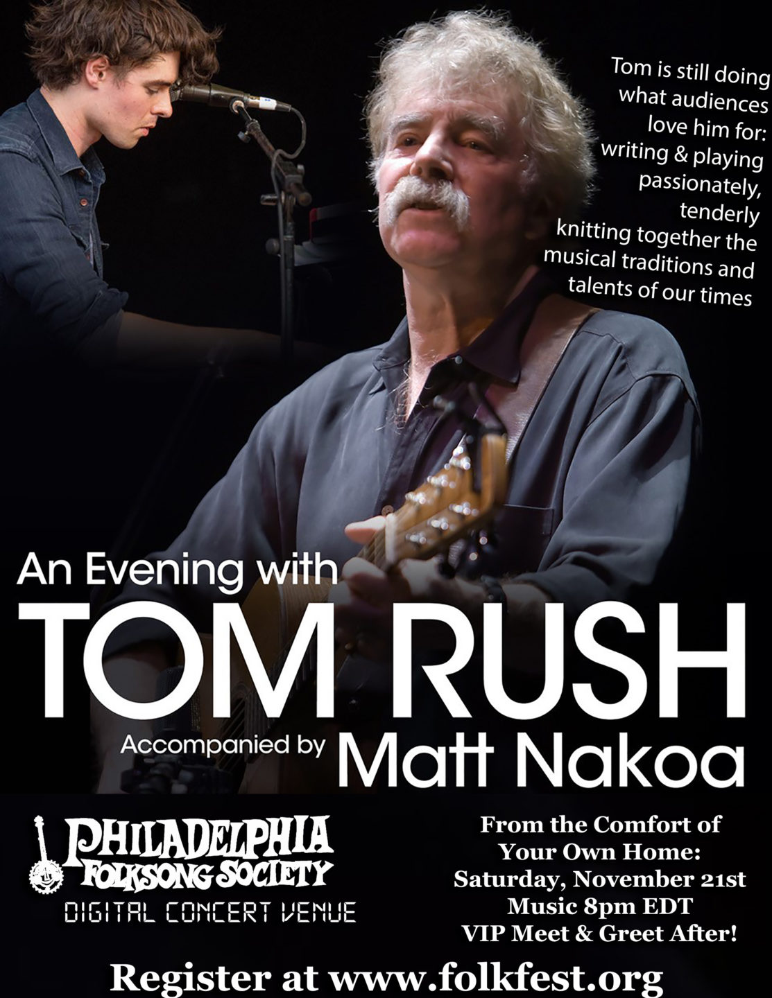 필라델피아 포크송 소사이어티(Philadelphia Folksong Society)는 11월 21일 오후 8시(북미 시간 기준)에 아티스트 톰 러쉬(Tom Rush)와 매트 나코아(Matt Nakoa)의 디지털 콘서트를 진행할 예정이다.