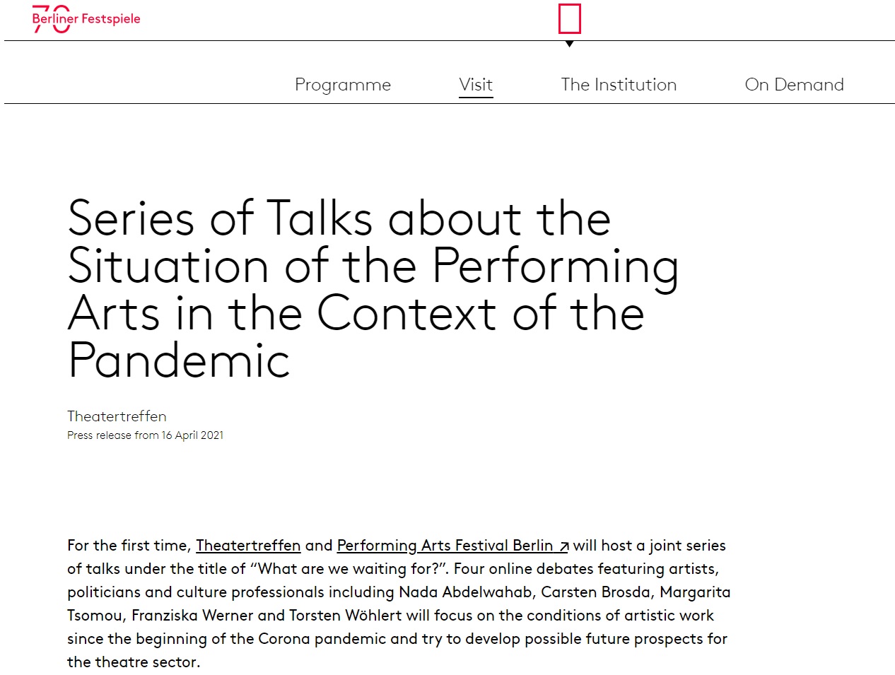 베를린 연극축제 극장 트레펜(Theatertreffen)과 베를린 공연예술축제(Performing Arts Festival Berlin)는 공연예술 전문가들과 함께 팬데믹 상황에서 “우리는 무엇을 기다리고 있는가?”를 주제로 한 온라인 좌담회를 개최한다.