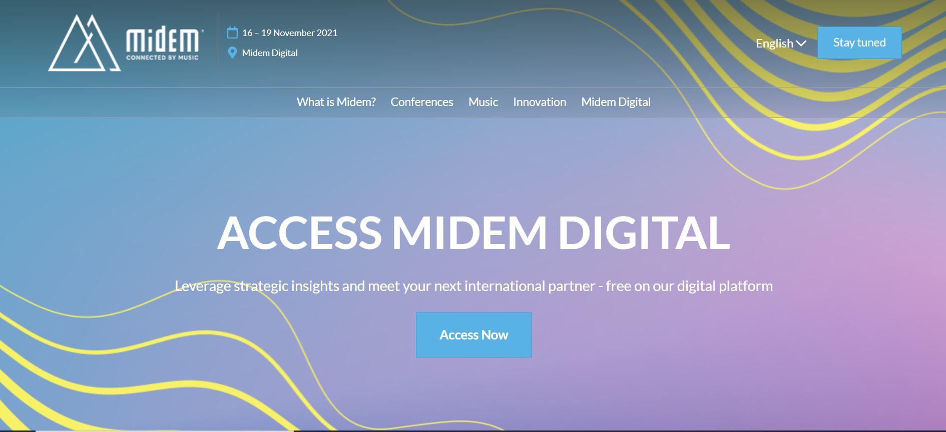 전세계 음악계를 선도하는 국제 행사인 MIDEM(Marche International du Disque et de l’Edition Musicale)은 2021년 온라인 행사로 11월 16일부터 19일까지 개최된다.
