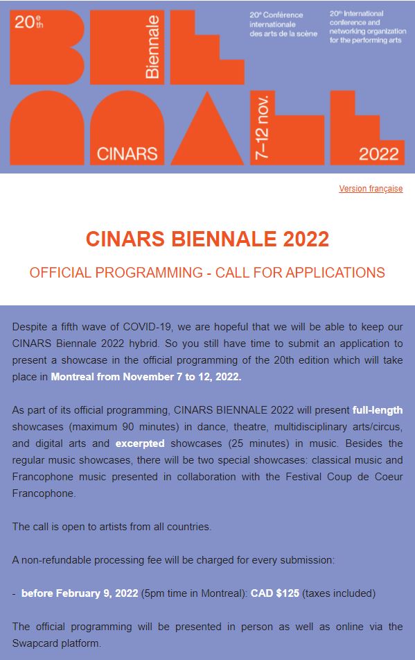 2022년 11월 7일부터 12일까지 캐나다 퀘벡주 몬트리올에서 개최되는 캐나다공연예술마켓(CINARS, 이하 시나르) 비엔날레가 쇼케이스(Project Presentation)를 2022년 2월 16일까지 공모를 연장한다.