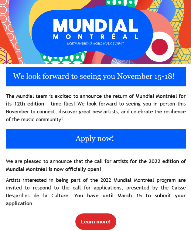 캐나다 음악마켓 ‘문디알 몬트리올(Mundial Montreal)’이 쇼케이스에 참여할 아티스트를 2월 1일(화)부터 3월15일(화) 자정(몬트리올 기준)까지 모집한다.