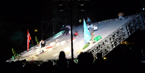 타레가에 도착하기 전, 피라 타레가는 전형적인 ’거리예술축제’의 하나라고 오해하고 있었다. 사전에 프로그램북을 보며 관람계획을 세울 때, ’IN’ 공연의 70%이상이 유료 공연이었다. 유료공연 중 일부는 야외 가설극장이나 건물의 옥상 등 퍼블릭과 분리된 야외에서의 공연들이었지만, 적지 않은 수의 작품이 실내의 극장 무대의 작품이었다. 실내 극장공연은 전형적인 연극 공연들이 많았지만, 서커스를 기반으로 하는 작품과, 어느 현대공연예술축제에서 만날 것 같은 다원적인 작품들도 눈에 띄었다. 그리고 실내 공연들은 70% 이상이 유료관객들로 채워진다고 한다. 거리에서 극장까지, 서커스에서 미디어 퍼포먼스까지 언뜻 백화점식 프로그래밍이 아닐까 생각할 수 있지만, 이런 다양함속에 프로그램들을 관통하는 방향은 보였다. 그 작품이 어디서 왔건, 다수의 작품들 속에서 남부 유럽 특유의 ’낙천성’과 인생에 대한 ’긍정’과 ’희망’이 보였다. 때로는 비통한 현실을 보여주지만, 인생을 비관하지 않는 찰리 채플린의 영화가 주는 ’Sweet Sorrow’를 느낄 수 있는 작품들이 많았다. 극단 몸꼴의 ’리어카 뒤집어지다’가 공식작품으로 성당 앞 광장에서 공연되었다. 거리의 서커스에 익숙한 관객들이 어찌 볼까 궁금했다. 관객들은 작품의 드라마가 충분히 전달됐는지는 미지수 이지만 수많은 관객이 자리를 뜨지 않고 한 장면 한 장면을 진지하게 관람했다.