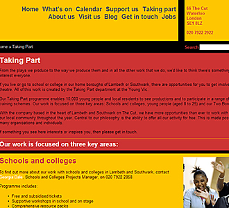 사회적 참여에 적극적인 영빅 예술감독인 데이비드 랜(David Lan)은 영빅의 미션을 ’지금과 미래의 위대한 관객을 위한 위대한 연극 제작’에 두며 정치적으로 민감한 문제와 국제적인 이슈, 소수자에 대한 소재도 과감하게 수용한다. 420석의 중극장과 2개의 소극장을 갖춘 영빅은 이러한 극장의 미션을 구현할 수 있도록 모든 공연에 있어 자유롭게 연출이 가능한 오픈무대를 제공하며, 객석도 공연별로 각각의 무대 디자인과 연출에 맞도록 직접 단을 쌓아 만드는 방식으로 설치한다. 교육 프로그램은 영빅의 시작이 교육 프로그램에서부터였던 만큼, 독자적으로 오랜 시간 구축한 다양한 프로그램과 네트워크를 확보하고 있다. 이를 전담하는 부서는 테이킹 파트(Taking Part)라는 팀으로 연중 독자적인 프로그램을 운영한다. 테이킹 파트에서 운영하고 있는 프로그램 중 특히 흥미로운 프로그램은 학교연극축제(Schools’ Theatre Festival)와 투 버러 프로젝트(Two Boroughs Project), 연출가 네트워크(Directors Network) 프로그램이다.