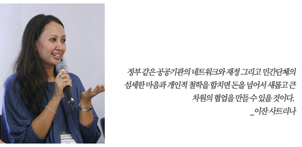 이잔 말레이시아공연예술에이전시(My Performing Arts Agency)도 독립기관이다. 우리도 예술에 대한 열정이 많다. 마이파는 국가기관과 긴밀히 협조해 나가고 싶다. 옥션을 통해 펀드레이징을 하고, 그것을 예술가들에게 돌아가게 한다. 온라인 시스템도 만들어 그들에게 지원하고 있다. 이것이 사람들이 민간단체가 수행한 일로는 기적적 일이라고 한 이유이기도 하다. 이런 공공 기관과 민간이 힘을 합쳐 펀드레이징을 하는 것은 어려운 일이다. 지난 보락아츠페스티벌(Borak Arts Festival)에서는 한국과 호주를 포커스 했고, 앞으로는 일본과 프랑스를 포커스할 예정이고, 이어 동남아를 포커스할 것이다. 한 사람이 콩을 굴려주면 모두 달려들어 사람을 모으고 기금을 모아야 한다. 나아가 정부 같은 공공기관의 네트워크와 재정 그리고 민간단체의 섬세한 마음과 개인적 철학을 합쳐지면 돈을 넘어서 새롭고 큰 차원의 협업을 만들 수 있을 것이다.