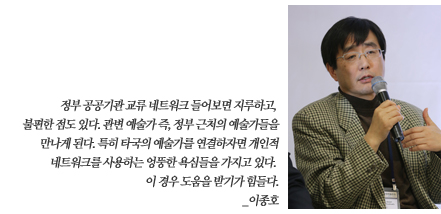 이종호 한국, 대만, 일본, 홍콩, 싱가폴, 호주, 인도네시아가 참여한 리틀아시아댄스네트워크에서 각국 1명씩 추천받아 공동 창작 혹은 솔로작 공연을 했었다. 철저한 민간 베이스 사업이었다. 정부 공공기관 교류 네트워크 들어보면 지루하고, 불편한 점도 있다. 관변 예술가 즉, 정부 근처의 예술가들을 만나게 된다. 특히 타국의 예술가를 연결하자면 개인적 네트워크를 사용하는 엉뚱한 욕심들을 가지고 있다. 이 경우 도움받기가 힘들다. 언제나 관변에 익숙해져 있기 때문이다. 정부 조직과 재정 그리고 정부가 모르는 민간의 구석구석의 네트워크를 합치면 새로운 필드가 개척될 것이다. 리틀아시아댄스네트워크 같은 경우 규모는 작지만 민간이어서 큰 기관도 있었다. 그러나 결국은 잘 안됐었다. 한군데 모여 연습하기도 힘들고, 나라마다 펀딩 지원 시기도 다르고, 제도도 달랐기 때문에 결국 중단되었다. 이런 자리에 올 때마다 중심이 너무 관공서에 중심이 가있는데 관과 민 사이의 장점을 섞어야 새로운 비전을 열수 있다 생각한다.