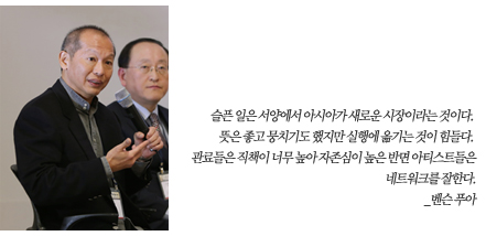 우선, 첫번째 네트워크인 아시아태평양 공연예술센터연합(Association of Asia Pcific Performing Arts Centers, 이하 APPAC)에서 나는 10년 동안 의장을 했다. AAPPAC는 처음엔 싱가포르-호주 네트워크로 시작했지만 현재는 주요 공연 센터가 회원으로 가입하면서 회원 간 성격에 맞게 변모하였다. 시장을 개척하고 교류하는 것이 취지인데, 아직 성공하지는 못했다. 협력과 협업에 대한 의견이 다르기 때문이다. 현재 우리는 대화를 통해 적절한 네트워크를 통하지 못하면 침몰하기 때문에 과감하게 무언가 함께 의견을 모아 해보자고 의견을 나누고 있는 중이다. ’비즈니스 서클’과 총회를 통해 네트워크 미팅을 하는데, 주요한 아티스트를 모시고 작품에 대해 의견을 나누다 하다보면 아티스트 중심으로 진행해야 한다는데 생각이 모아진다. 두번째 네트워크는 국제공연예술협회(ISPA)인데, 이 국제 협회에는 더욱 많은 아시아 인사의 참여가 필요하다. 아시아 출신으로는 내가 최초로 참가했었는데 아직도 외롭다. 아직까지 백인 중심의 협회이고, 한동안 미국 중심이었는데 남아공, 브라질 등으로 개최지를 이동하면서 아프리카와 남미의 회원까지 흡수했다. 그러나 여전히 아시아 멤버가 더 필요한 실정이다. 싱가포르는 작은 도시국가이기 때문에 주변 국가들과 공존한다. 필연적으로 교류가 필요한 국가이기에 글로벌 네트워크, 아시아 네트워크가 더욱 필요하다.