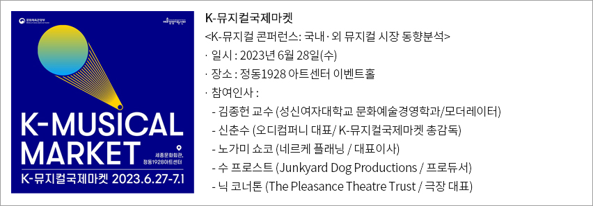 코로나19 이후, 공연계는 어떻게 변화했을까? 지난 6월 28일, 문화체육관광부와 예술경영지원센터가 주최·주관하는 ‘K-뮤지컬국제마켓’에서 ‘펜데믹 이후 시장 회복성과 뮤지컬 트렌드 및 이슈’를 주제로